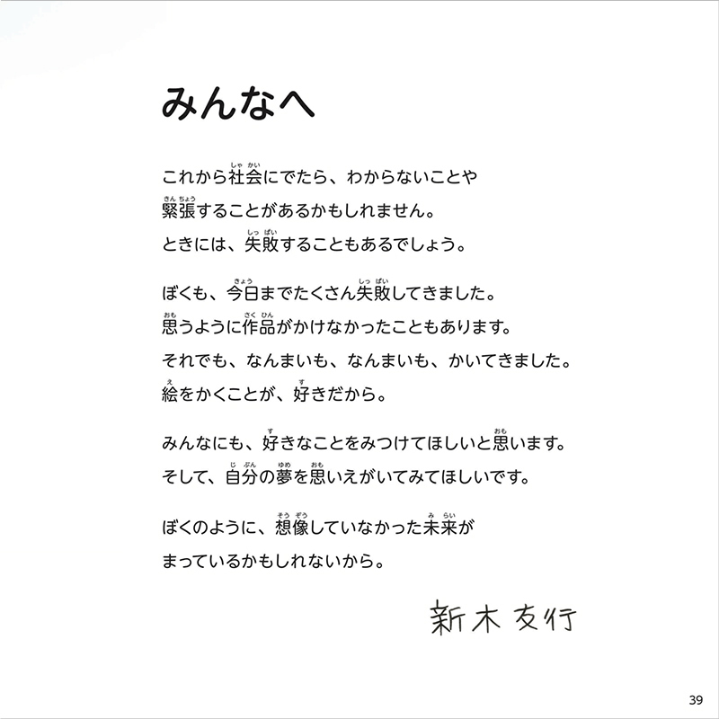 アーティストとして活躍する新木さんが子どもたちに贈る言葉とアートをお楽しみください。